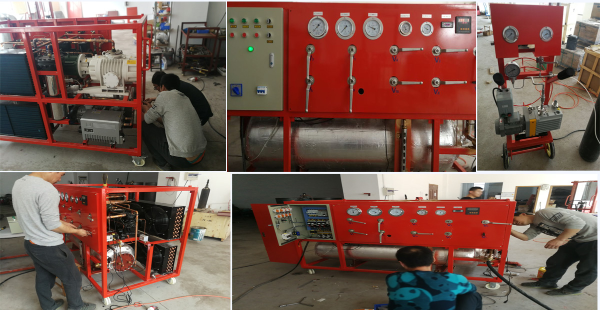 在充放時(shí),首先利用本裝置的真空泵對SF6電器設(shè)備(或鋼瓶)和連接管路進(jìn)行抽真空,然后直接利用壓差或利用壓縮機(jī)的抽吸性并造成一定的壓差將裝置貯存容器內(nèi)的SF6充入SF6電器設(shè)備,直至達(dá)到所需的工作壓力。在需灌瓶時(shí)則同時(shí)利用如前所述的R22制冷劑的特性,將液化的SF6直接灌入鋼瓶。